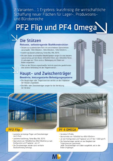 • Lackierte Ausführung, Farbe Blau RAL 5015. • Je nach Konfiguration und Traglasten pro m² (bis 1.000 kg/m²).